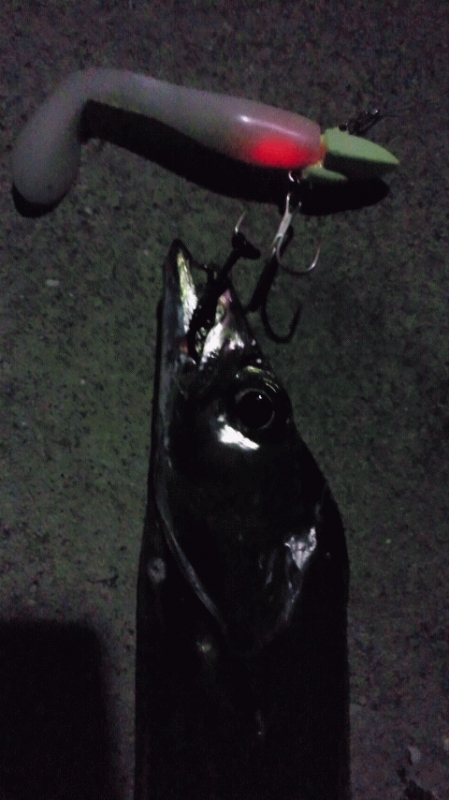 天気も良く潮周りが良いので行ってしまいます。ポイントに着くとタチウオが18cm級のアジを追っているのが確認できる。一瞬考えましたが、迷わず匠魚を選択。アジングするか?考えてしまいました(笑) マナティーのシャクリでワインド開始、数回アタリはあるが・・・、そこでケミチューンワインド「RED」を装着、するといきなりHIT!それからスイッチが入ったのか猛ラッシュで次々と水揚げに成功! ZZヘッド1/2oz+タクミノー75の組み合わせです。