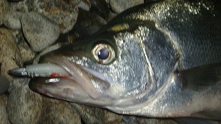 下げ五分目に現場に到着・反応はあるがセイゴクラス(涙)二本キャッチできたが、ジアイ終了~・上げのジアイまで待つことにしました。徐々に川に潮が入ってきて、マナティーを潮の流れに乗せ潮に上手くからんだ時にドスンと70オーバーの平鱸がヒットしました。