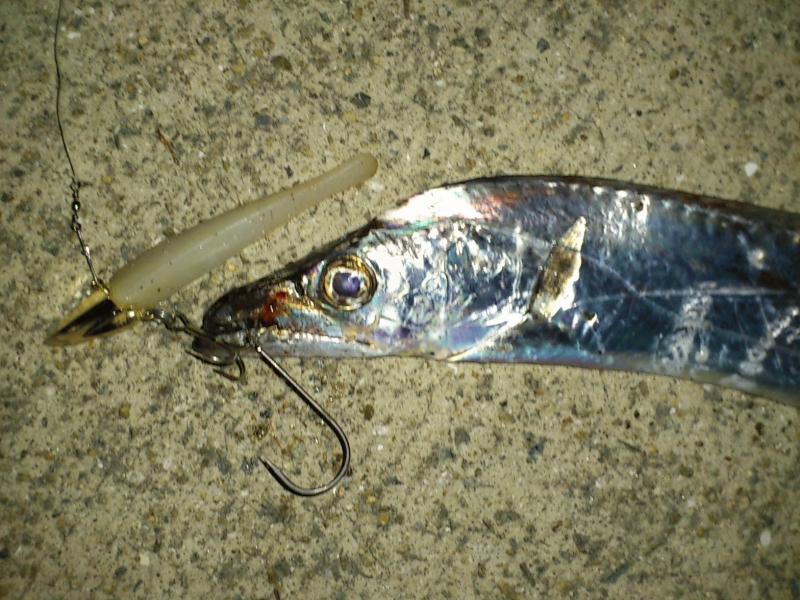六甲アイランド、ZZヘッド1/2ゴールド&マナティー75MT-08、一時間でタチウオ2匹確保!居ます! 指三本。