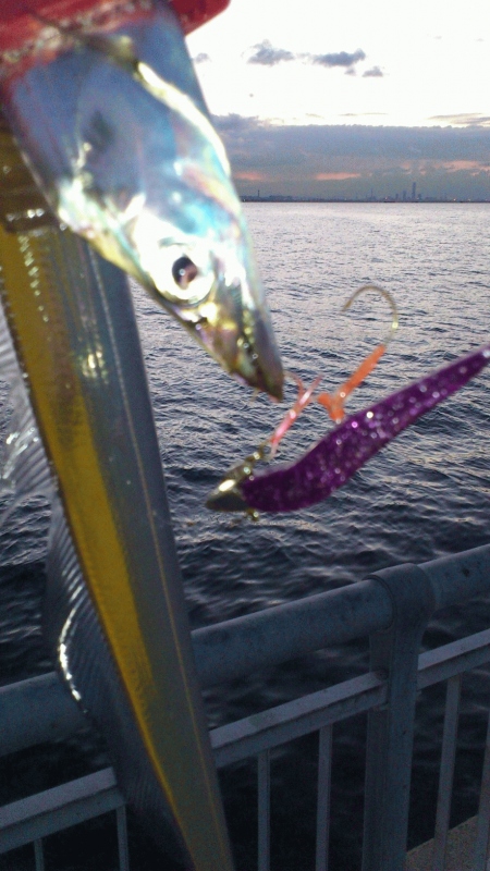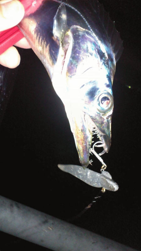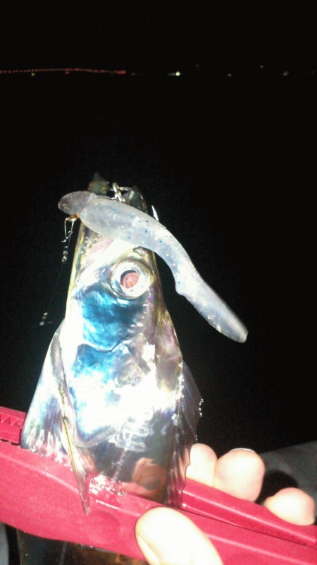 AM5:00を過ぎたあたりから、こつんと軽い当たりがあったので、再度匠魚のTK-K6、3/8ozに変更してみると、当たりましたが乗らず。もう一度同じところで引いてくると、ガツンときました。上げると、匠魚がどこかに飛んでしまったのか、ZZヘッドとタチウオだけになってました(とほほ・・・)。プチ地合いに突入したのか、30分ほどで、立て続けに4本ゲット。匠魚TK-01、マナティー90 TK-K6などでヒット、周囲も釣れてました。