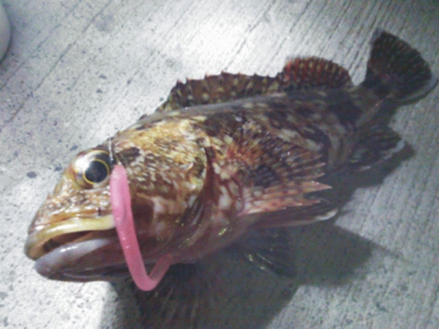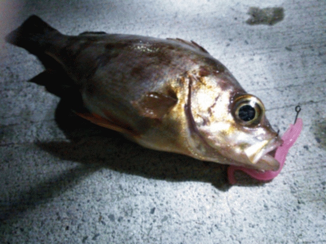 表層で群れるメバルの猛攻をかわしボトム着低直後、ガガネヒット20cm。