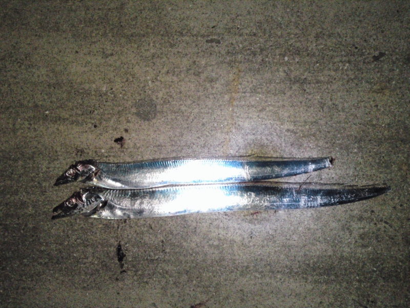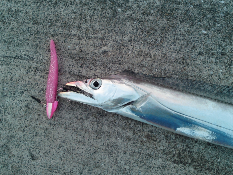 夕マズメ狙いの短時間釣行。周りを観察すると、北向きの水深のある側でタチウオが釣れているのを確認。日がまだ沈む前だったのでMT-K1を選択し、ボトムを中心に攻めると。三回ボトムを取り直してしゃくりあげている最中に1本目がヒット。短いですが、指4本の良型をゲット。その後同じパターンでやるが、あたりなし、日が沈んでからは、カウント5にしてカラーもMT-01に変更して、スローに表層付近を狙うとガッツンとこの時期には珍しい激しいあたりで指3本クラスをゲット。回遊している数は少なく厳しい状況ではありますが、ワインドの威力は凄いです。