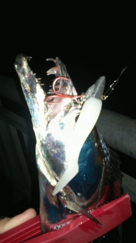 今回は、3/8ozのZZヘッドに匠魚のスパーグローで開始。蓄光させるといかにも釣れそうな感じがしていましたが、しばらくは当たりなし。30分ぐらいしゃくっていると、軽い当たりがありましたが乗りません。気配が感じられたので、再度ゆっくり目にしゃくっていると、ゴツンと大きな当たりがありました。手前に引いてくると、だんだん重たくなり、上げてみると指4本、ジャスト100cmの良型(ドラゴン?)でした。ドラゴン対応のサーベルワイヤー75mmを使っていたので安心して引き上げられました。