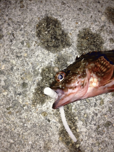 カッティングベイトにオフセットフックをつけて、沖に向かってキャスト、底まで落とした後、チョンチョンしては止めての繰り返し。しばらくして、もぞもぞと変な違和感がありましたので、アワセをいれて巻き上げてみると、ガシラでした。