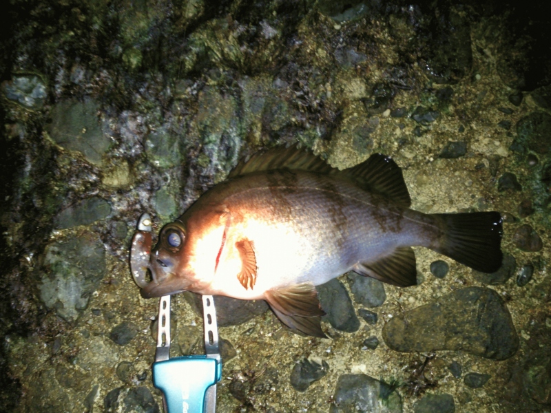 ここで、気分転換にマナティー38の02をセット。4回シャクってフォールを繰り返していると、フォール中に待望の初ヒット。ちょっと小振りのメバル君。