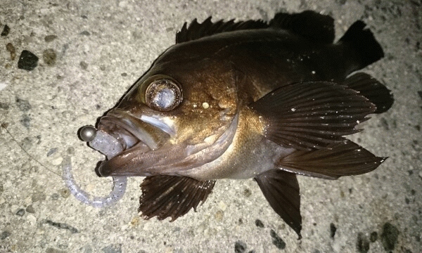 そこから狙いを底付近に変更してみると、良型のメバルがポツポツ釣れました。