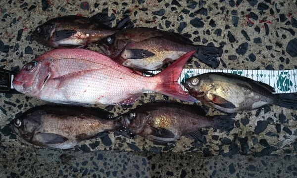 表層でアタリがないのでレンジを下げていくと、マダイがヒット!