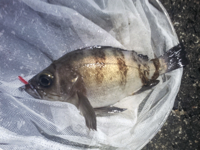 テトラ際の海藻のエッジをマゴバチのジグヘッドリグで丹念にさぐっていると海藻の影から良型のメバルが食ってきました。