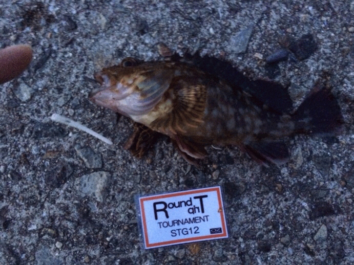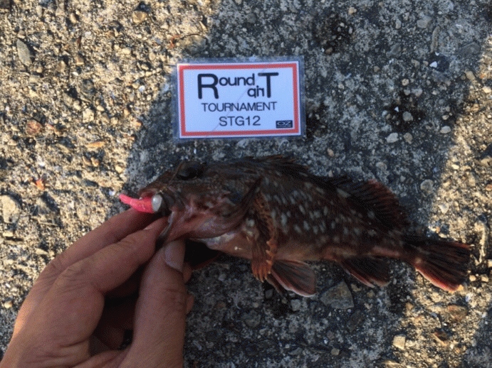 大会受付・開会式の後釣り場に到着し、海を見ると濁ってます。連日の暑さが原因? まずは鯖や鯵が回遊しているかもと言う事でライトワインドで狙います。MT38-07・01・08・10・K20でボトムから中層・表層付近まで探りますが反応無し。どうも鰯以外はお留守のようです。やっと反応があったのはボトムを丹念にリフトANDフォールで誘った時にコツンとヒット。ターゲットのガシラ。その後は当たりが出ない為、ケーソンのつなぎ目をダウンショットで探り歩く事に。隙間が大きく潮通しが良さそうな所を重点的に探ります。ボトムからフワフワとゆっくり巻きながら誘うと竿先がグッと沈みヒット。この後、違う繋ぎ目でガシラのマンション発見!そこから連発!今日は、チャートやナチュラルが良かったようですが、パールホワイトもいつも通り良い働きしてくれました!耐久性に動きとガシラにバッチリですね。