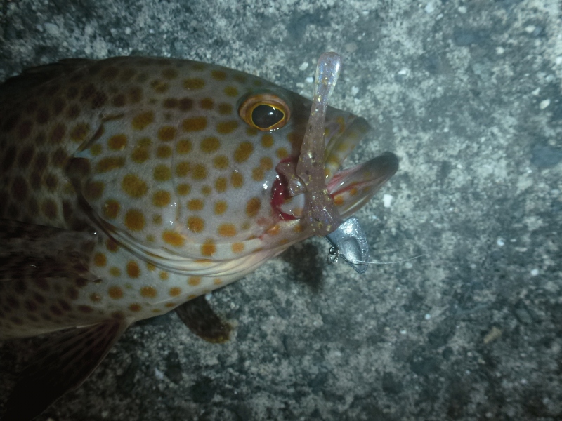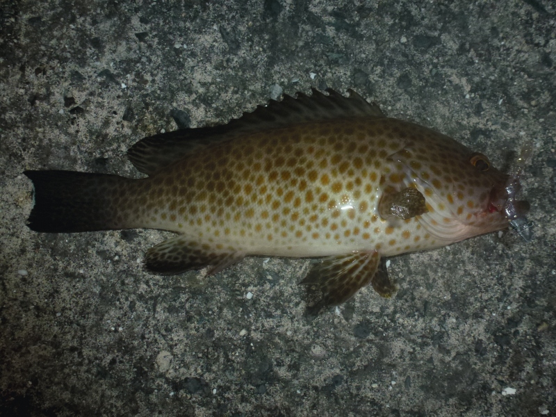 心配だったのでタモを使ってあげると,良型のオオモンハタでした。写真のとおりフグにかじられています。