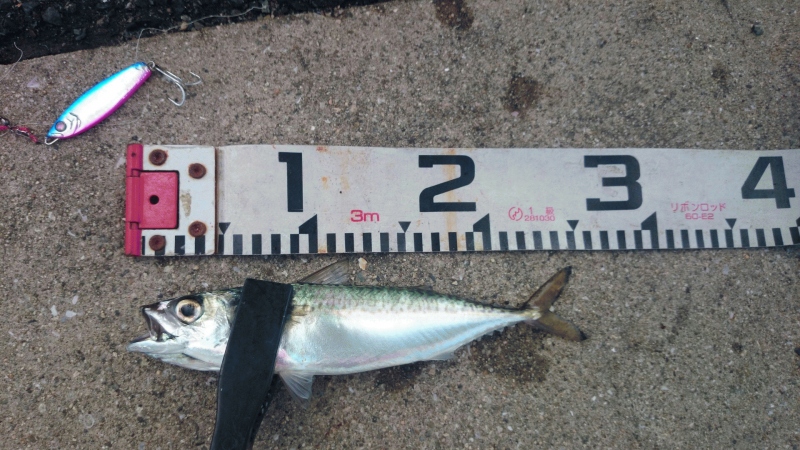 一旦底を取ってから大きく3回しゃくり、2回軽くしゃくってやると25センチのサバが来ました!