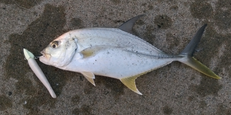 キャストしてすぐにドスンっとヒット!タチウオだと思い巻いてくるといきなりダッシュ!そして強烈な突っ込み!それを耐えてなんとか浮かしてくるとなんと、60cmはありそうなカースビー(ゴマフエダイ)ではありませんか!完全に自己記録サイズ(゜ロ゜)