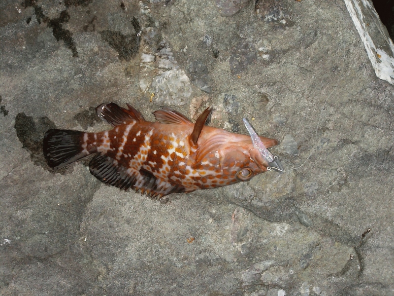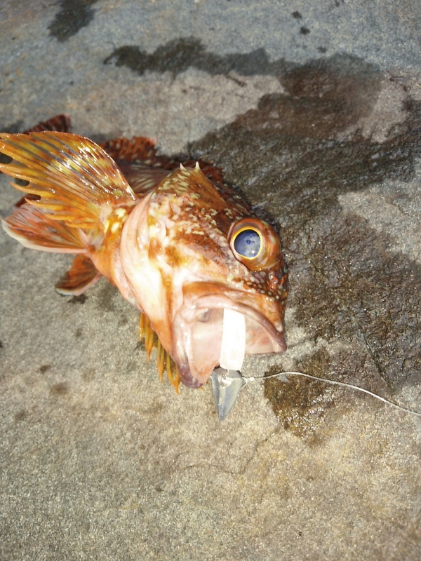 続いて大きな岩影を見つけたのでキワを通すようにすると、ひったくるアタリが、強烈な引きで上がってきたのが15cmのまぁまぁのサイズのガシラ。