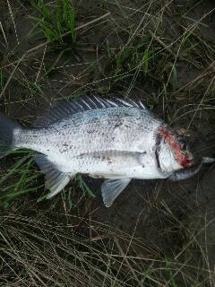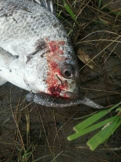 まずは かけあがりを カッティングベイトで 探りますが 反応がなく 次に ボトムゴビィで ボトムを擦りながら 探りますが 反応がなく 今度は 集魚力のある 匠魚に 変え ボトムを叩いたり 巻きを入れたりを 繰り返し フォールからの巻き始めで 引ったくる当たり!合わせをいれ ロッド立てて 水深のあるところで 浮かします。