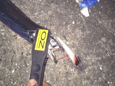 やっと7時半過ぎ、中層上付近早めのシャクリにて、1/2ヘッドにホワイトパールレッドヘッドの組み合わせにてベイビーサイズ一本ゲット!