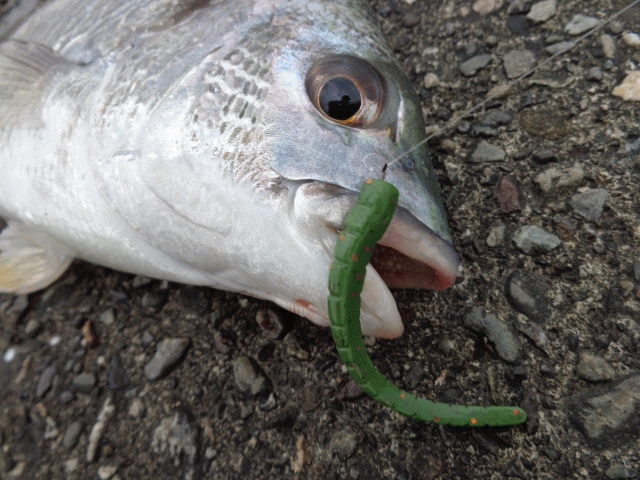 ワームはカッティングベイト3inch ハード カラーは#21 キビレグリーン。
