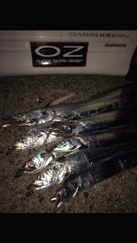 まだ明るいうちはMTK-5で魚を寄せてくるイメージで、その後は好調のL-3に切り替えて18時33分、沖のボトム付近でようやく一匹目。同行した親父と隣りの方もほぼ 同時にヒット! ジアイ突入!かと思われたが‥ 一気に釣れる感じではなく‥ポツポツ状態。 しばらく当たりも無いまま心の中で『ヤバイ‥』の繰り返しでしたが、先週大将に教えて頂いた夜の太刀魚の性格を思い出し、スローにスイッチを入れれる匠魚に切り替え 一投目カウント3でガツン!1/2.TK-60-08、 続けてガツン! 喰い方も強烈で今日は60サイズが良かった感がありました。結果2人で8尾で終了。また来週チャレンジです!