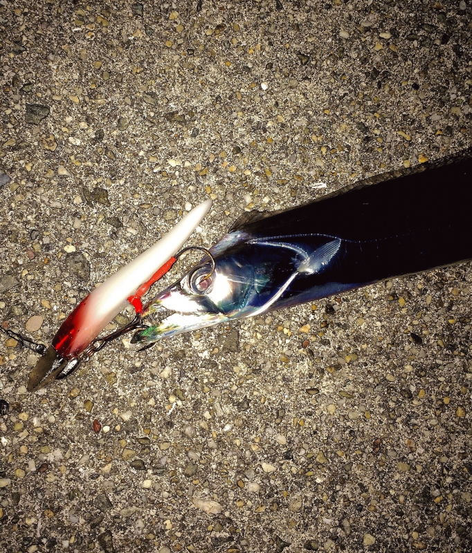 3時半頃、MT-L3でかなり早いしゃくりを数回したあとのゆっくりとしたしゃくりに変えるとヒット!F2.5のタチウオをキャッチ!