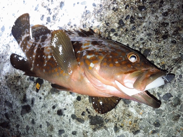 絶好調の頃に比べるとキジハタの数も少なくなった様な感じがする何時ものポイントですが、ボトムをしっかり取りワインドアクション後のフォールで当たりが有りヒット。