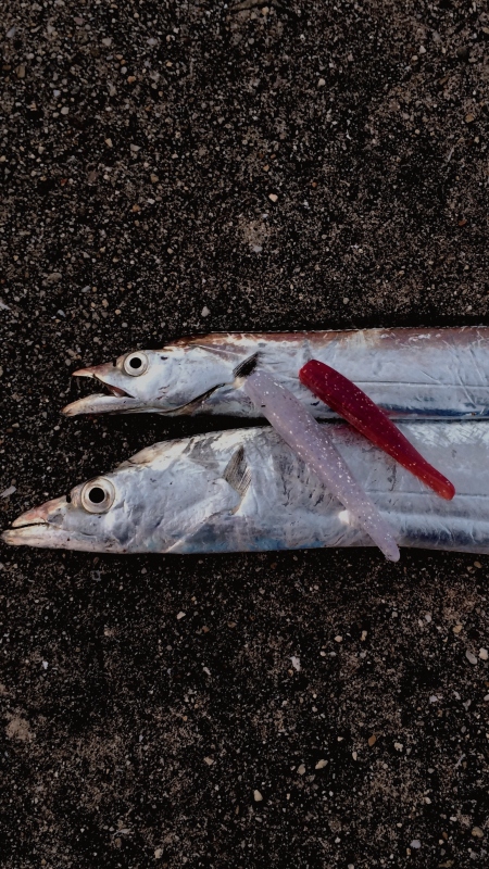 マナティ75 MT-K5にケミチューンはレッドで1投目、根掛かりしたかと思うくらいの強烈なバイト!しっかり追い合わせをしてF3の良く引いてくれたタチウオをキャッチ!