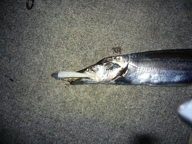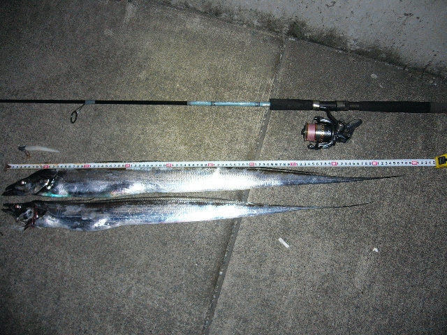 早速周りの人が見に来て、太刀魚釣れるんだ~しかもドラゴン!と驚嘆後、仕掛けは何?と聞かれたので、自慢げにOZさんの営業担当となり事細かく説明。やはりマイナーポイントなのかワインドも知らない方でしたが、興味をもたれていましたので、今後ワインダーが増えることになりそうですが、マイナーポイントでのこの釣果がライバルを増やしてしまったようで、逆効果かなと思いつつ継続すると、20分置きくらいに当たりはありますがなかなかフッキングできず少々ストレスが溜まっている19時20分に久々の当たりからフッキングに持込引き上げるとF4、90cm。