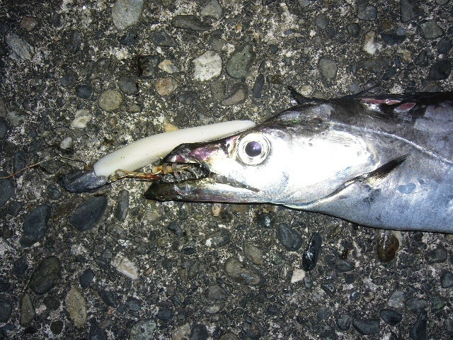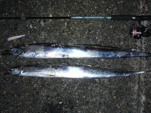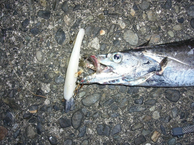 大事なManateeを数個ボロボロ(泣)にされながら、Manateeとワインドの威力を逆に再確認しながら継続すると、最近の時合である18:30分に今度こそガツンと太刀魚の当たり。