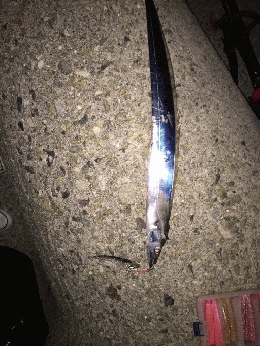 薄暗くなっていつもあたりや噛み後がついてもいい時間になっても全くアタリがなくワインドシャッドのパールホワイトに変えた瞬間ショートバイトがありテンションが上がったのですがまた沈黙が続きケイムラピンクファントム90で表層を探るとショートバイトがまたありそこでクリアウォーターに良いMT-3をチョイスし早めのしゃくりの後のスローワインドをしていると急に軽くなりタチウオが浮いてたので合わせてゲットしました!なぜか変な食い方で、僕の経験にない当たり方でした^^;