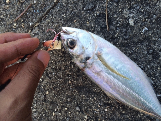 ぼうずは逃れたので気持ちも楽になり、リズミカルにシャクっていると・・・中層付近でHitヽ(*>∇<)ノしかし・・・重みは無いのに走ります(-ω- ?)なんじゃこりゃと思いながら寄せてくると、良形のアジでした(≧ω≦。)これもMT-L3でした。