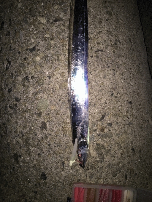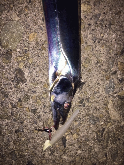 カラーをK2やパールホワイトに変え試すもショートバイトばかりでもう一度グローに戻すとゴンっとさっきよりも強い引きがあり指4本に近いタチウオをゲットです!その後は時々ショートバイトがある程度なのでzzheadを3/8に変えマナティーをMT-K3をチョイスし超スローなワインドをするとガツンとヒットしましたが手前でフックアウト^^;