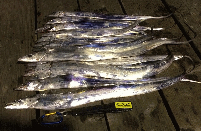 午後5時過ぎに、今まで強い北風で鏡のようになっていた海面が鳥山が立つくらい一面カタクチイワシのボイルになった後、タチウオ祭りが始まりました。