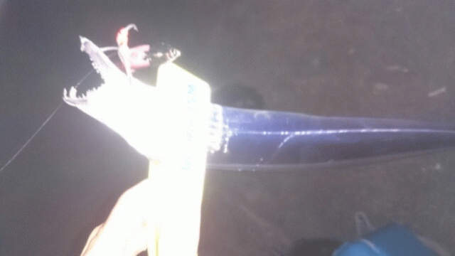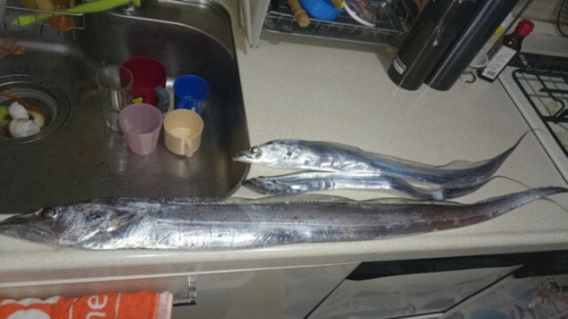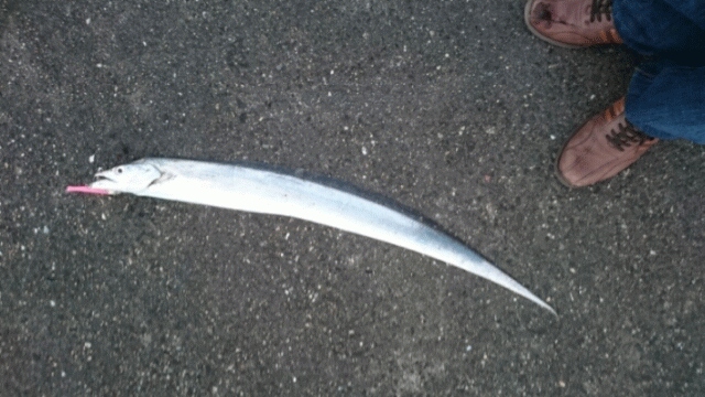 ドーンと来たので、スレ掛かりかと思いましたが、上がってきたのはF4.5 97cmの立派な太刀魚!自身のリミットメイク!なかなかのファイトを楽しめました!