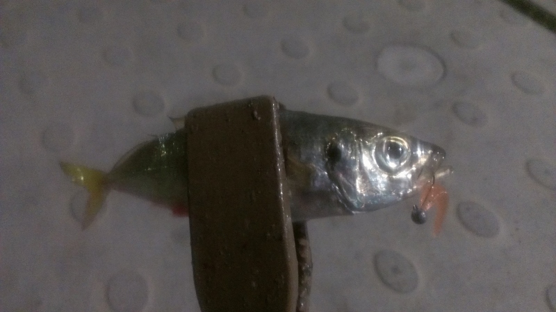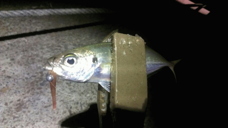 隣にはサビキマンでしたので、アミについていなさそうな、ちょっと遠めの常夜灯の明暗のアジを狙い撃ち。