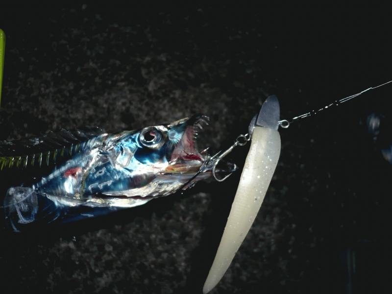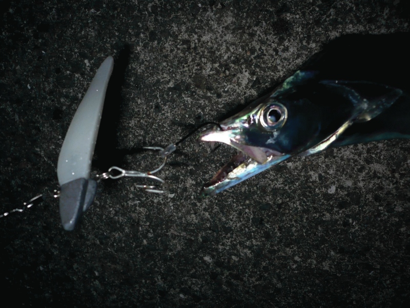 その後ラインプレイクしてマナティー08がなくなったので、「タチウオ.com」のプレゼントワームに夜光部分があったのでそれを使ってみるともう1匹追加することができました。