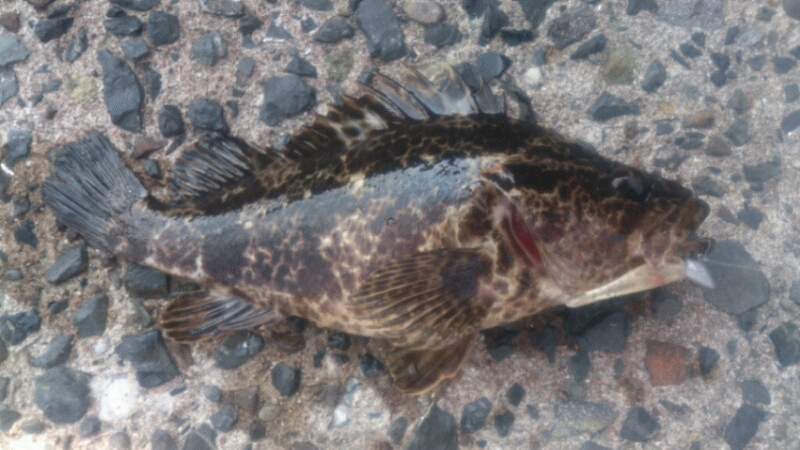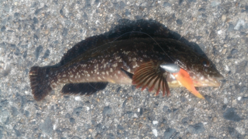 ここで少し場所移動をし、また同じような海藻の多い敷石周りを探ると、着底→3~5回ダート→フォールというパターンでタケノコメバルが連続ヒット!