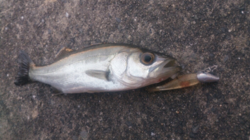 メバルを釣っている途中、船の影でじっとしているセイゴの群れが見えたので、すかさずマナティーをキャスト!!さすがに明るい時間に見えているセイゴは厳しいかと思いましたが連続ダートで一発でした(笑)