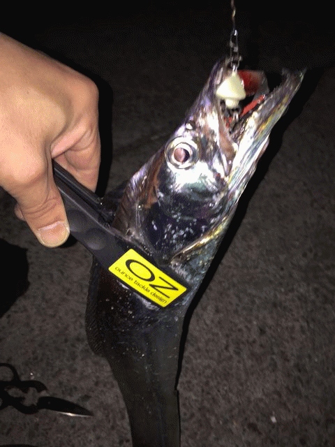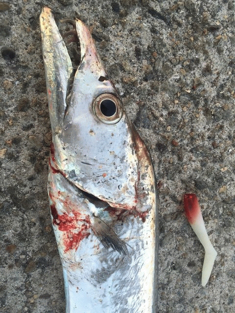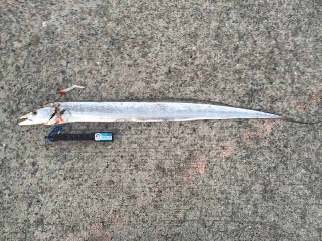 今までに経験したことの無い強い引きに戸惑い、手元に来ると更にグイグイと暴れるような引き込みがありましたが耐えて抜き上げるとF4強102cm、重量感溢れるドラゴン級タチウオでした。もちろん自己記録更新!