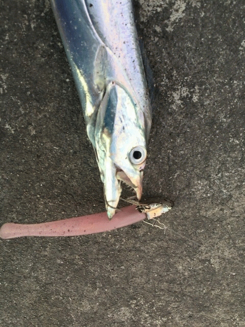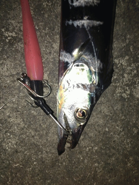 サンプルカラーのピンクでボトムを探っていると噛み跡があり薄紫のサンプルカラーに変えボトムを探り足元付近でゴンっとヒット!上がってきたのは指3本のまあまあのタチウオ!大将の動画解説のしゃくり方をそのまま真似した感じで釣れました(^^)