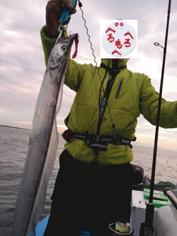 でも、影響が大きいのか、ベイトも出ずにアタリも渋く、最近の大将のワインド対策を実践(しゃくってフォールを1秒以上の間隔で底を丹念に)し、念願の1本(F4.5。後で計測したら107cm)。大物ゲット!(船長が撮ってくれた1枚です)