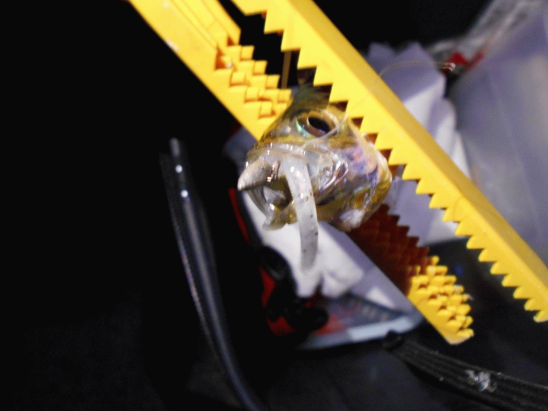 マジックグリーン、スペシャルグリーン、ケイムラ・クリアーブルー/ブルーラメとローテーションを繰り返し8匹釣ったところで風が強くなり釣りが困難。
