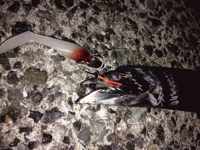 今年の釣り初めは、西宮ケーソンへ!いつもの二つ目カーブを過ぎた所です。ワインドシャッド(グローレッドヘッド)にてキャスト開始!当たりが出だしたのは、3時過ぎです。3時台に80cmF3ゲットです。その後当たりが遠のいて2本目ゲットは、5時過ぎでした。まだまだ太刀魚釣れそうですね。