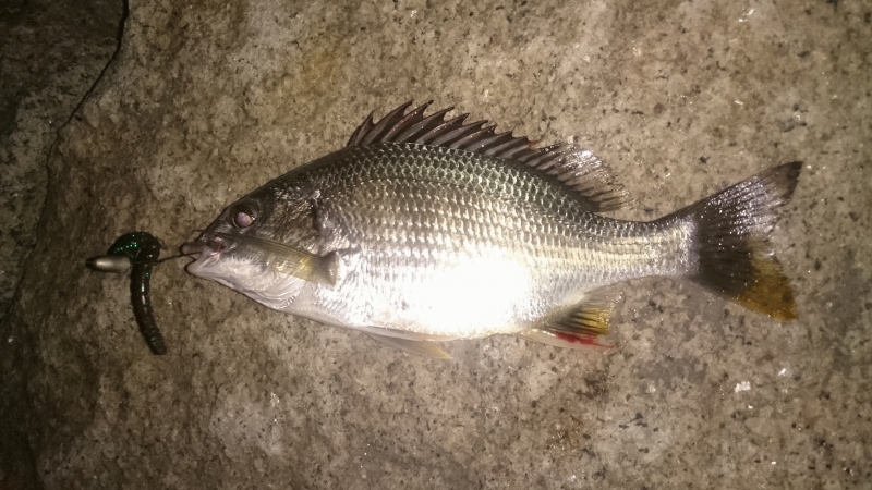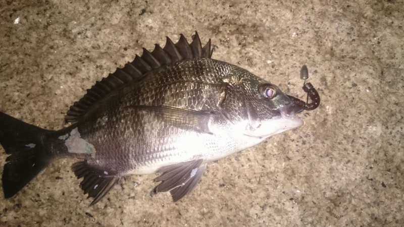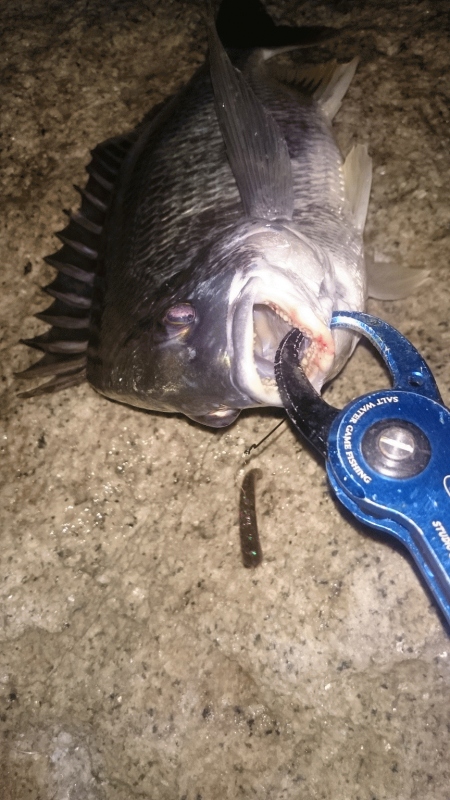 このパターンで引き続き2匹目はサイズアップし35センチのキビレ、そして30センチの真チヌを追加して、その後2回のバラしとアタリが遠のいて納竿としました。カラーは全てプラム/グリーンラメでした。