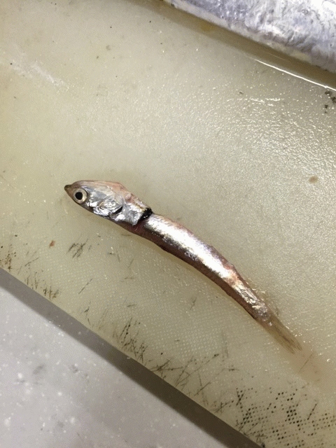 帰って捌いてみると、ベイトフィッシュが出てきました。サイズは7センチ弱、ワインドシャッド75 マッチ ザ ベイト!