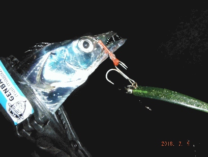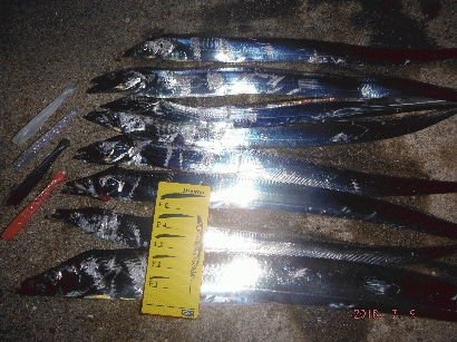 19時30分過ぎからZZ-Head1/2にMANATEE(90) MT-AN1、1秒1回程度の強めのシャクリでワインド開始。も、しばらくは何の反応もないまま・・・19時45分頃、ゴミを引っ掛けたような手応え、その正体はF2本弱のタチウオ、小さいけど今日も出会えたことにホッ。
