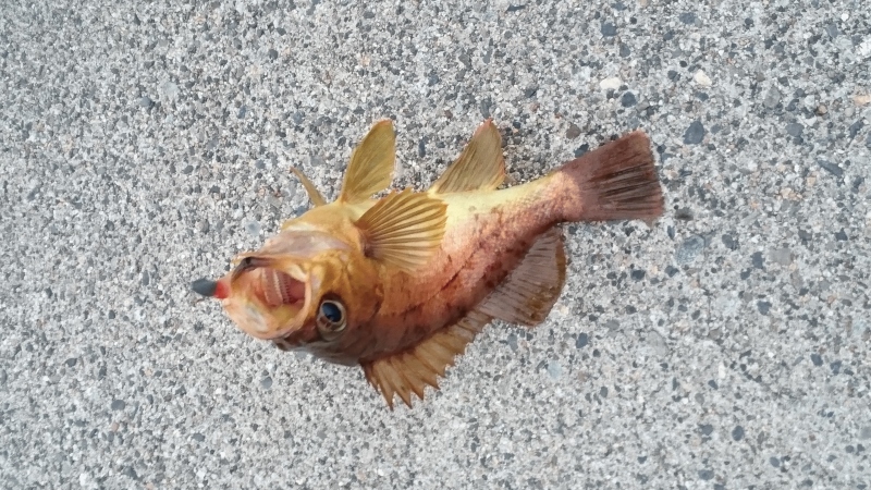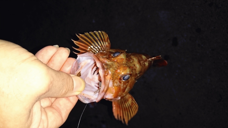 慎重に寄せてきたつもりが岩にへばり着かれてしまいます、ここで焦ってはいけません、少しテンションを緩め様子見・・・力が揺るんだ瞬間一気に引き上げゲット!上がってきたのは良方カサゴ!自己最高記録更新でテンションがあがります。しかしその後アタリもなく雨まで降ってきたので終了としました。