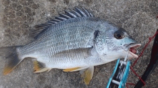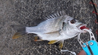 魚が小さいのか、シャクリが合わせとしては弱いのか、バラしが続きましたが、しばらくやってコツが掴めてきたと感じた瞬間、32㎝キビレをGET!!立て続けに手のひらサイズも。