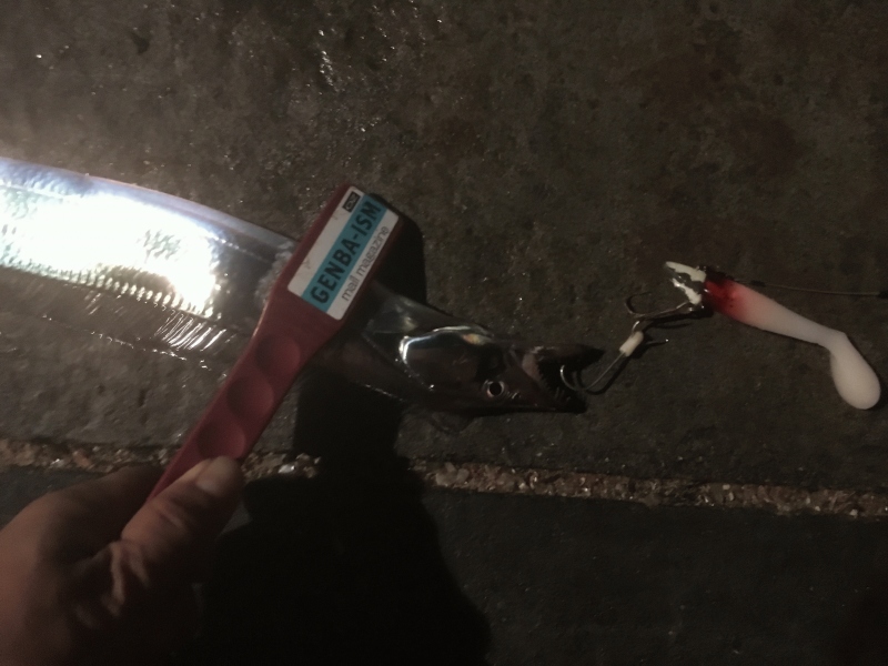 久々に舞鶴湾のいつものポイントへ太刀魚狙いで行って来ました。今日は短時間釣行の為、マナティとワインドシャッドのパールホワイトとグローに絞りワインド実施。ボトムから各層をシャクリ方を変え探る事、開始から90 分が経過し諦めかけていたその時、回収仕掛けていたワインドシャッド レッドベッドにバイトがありラッキーな1匹をゲットしその後数回キャストするがバイトも無く帰路に着いた。