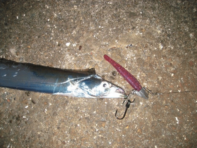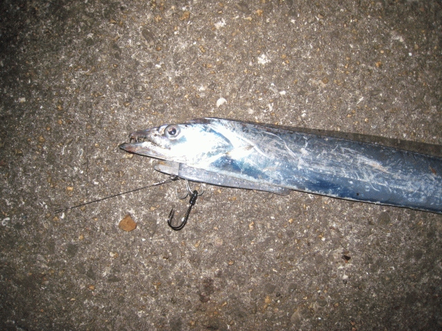 いよいよ武庫川一文字にタチウオが接岸したとの事なんで 出撃! 船で大将が「今日は西側がいいと思いますよ」とのアドバイスなんで6番で降りて西側へ。タチウオが釣れるまでは2号のシンカーのキャロでアジング。18:30からワインド開始してしばらくしたら遠く離れた大将がヒット。そして近くでも釣れだし 水面にイワシがふらふら泳いでるのを見てk-3にしたらバイト!ならばとk-6にしたらヒット! お隣さんはk-4でヒットしてるのでマネするがいまいちなんでk-5にしたら連発!試しにレッドヘッドにするも反応無し。て、k-1にしたら着水から沈めてる途中で連続ヒット~!暗くなってからはパールホワイトに好反応でk-2はさっぱり。まだ行けそうでしたが雷雨の為引き上げました。今日はケイムラに好反応でした。