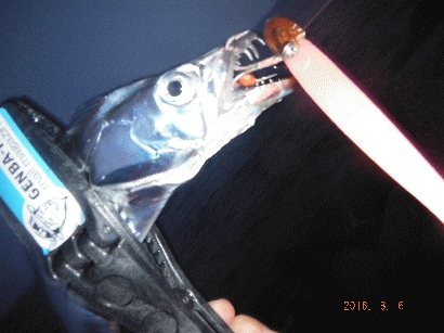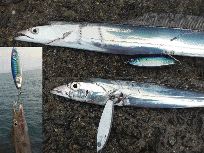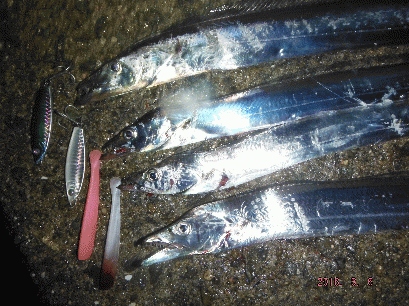すると、数投目のフォール中に「ぬるっ」とし違和感が、すぐに合わせを入れると「ククッ」という生命反応。フックアップに成功。時計の針はまだ6時。エソか?と思いながら・・・姿を見せたのは銀色の魚体。なんと、こんな時間からタチウオがヒット。(スレですが)