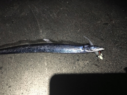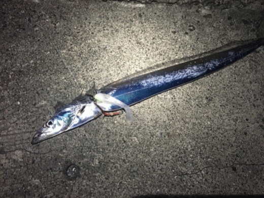 毎日好調に数があがっている武庫川一文字。期待を込めて午後6時頃からZZ-STAPを使って沖合ボトムから調査開始。南からの風で少しだけ投げにくいですが底を感じるには影響ない程度。海は濁りあり。白波が立つ状況ですが、タチウオの気配がありそうな雰囲気です。ボトムからZZ-STAPのシルバーフラッシュを3~4回チョンチョンとしゃくりフォールさせるとコツンとヒット。ブルブルと竿先が震えるサバがヒット。ここから延々と続くのかと思うぐらいのサバラッシュ。。。鰯の大群が接岸するも大型魚に追われている気配は無く、前日までのラッシュタイムを過ぎてもタチウオの姿を見る事が出来ません。周りを見てもヒットせず。もしかして気まぐれな夏のタチウオは去った?とおもいつつワインドシャッドのホワイトヘッドに変更すると午後7時半前にヒット。上層付近でのフォールでヒットです。スレでしたが嬉しい今シーズン初タチウオです。その後同じようにヒットさせ、息子を連れてきていたので8時の船で帰ろうと準備し、歩いて船着き場に急いで向かう最中に船が出てしまい延長決定(汗)。そこから初使用のマナティーピンテールのグローをセレクトし、アクション弱めのシャクリ幅狭目で誘うとヒット。今回は、グローカラーなのでライトで、蓄光させた1投目にヒットする確率が断トツに高かった事です。光が弱まると当たりが遠のき、蓄光させた1投目でヒットすると言った状況でした。今回はケミホタルをつけていなかった為こう言う結果だったのかも知れませんが。。祭りのようではなかったですが、楽しめた武庫川一文字釣行できた。マナティーピンテールやりますね~。