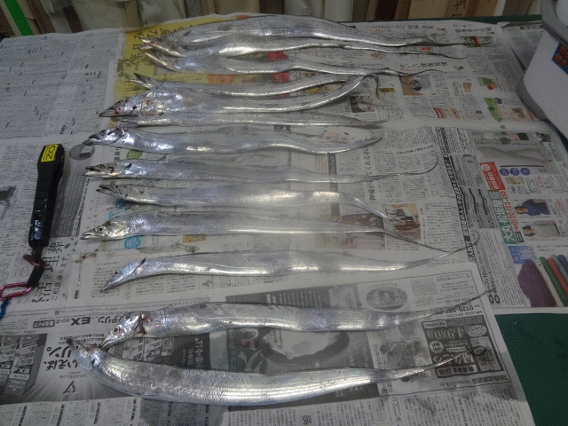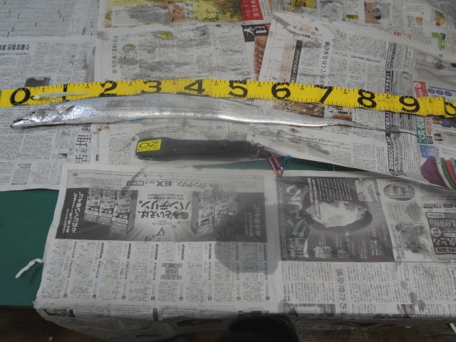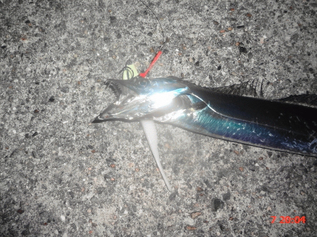 昨日に続き今日もタチウオ釣行、今日もマナティピンテールスーパーグロー、風がきついのでZZヘッド8分の5オンスで、投げて着水後、カウント15くらいからしゃくり始めます。午後7時過ぎくらいからまわりでヒットしだすも、当たりなし、